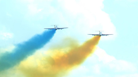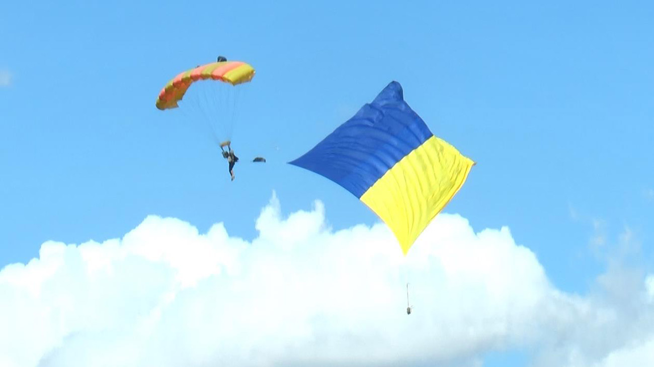 В честь годовщины независимости страны парашютисты развернули сине-желтые флаги, один из которых имел размер 9 м *12 м.