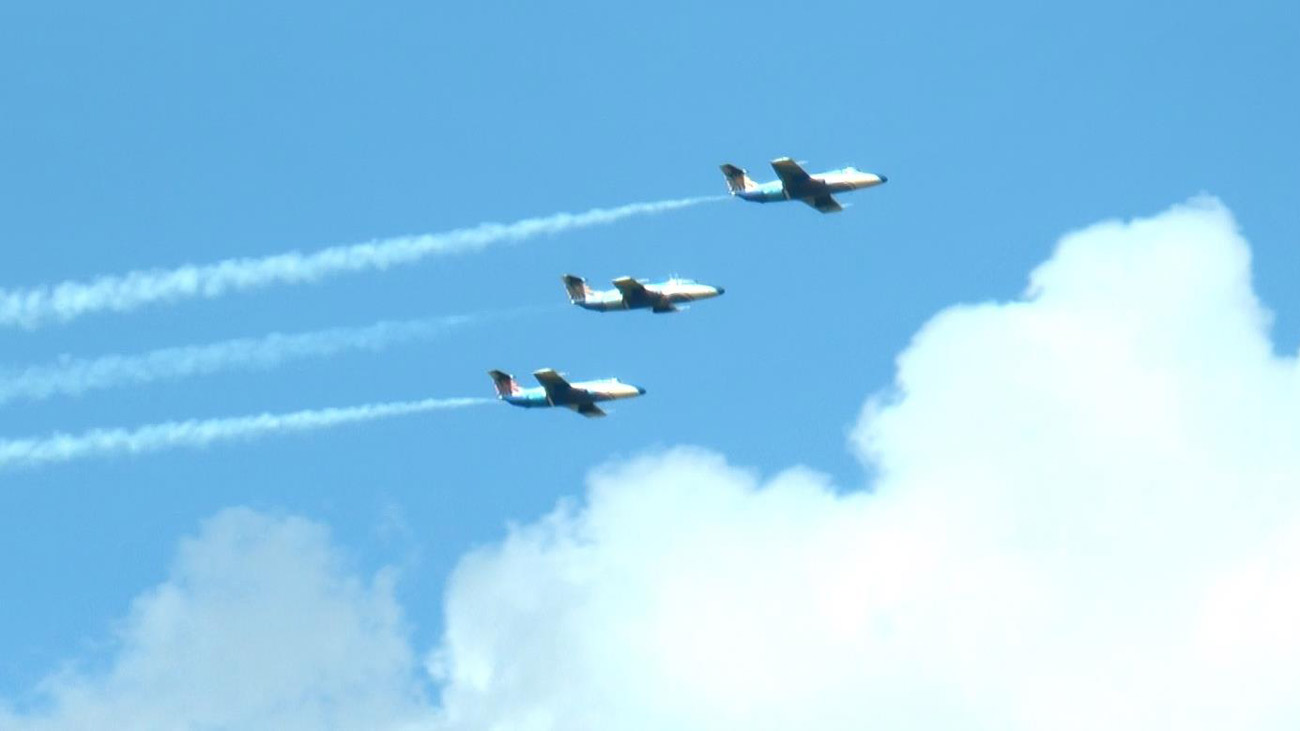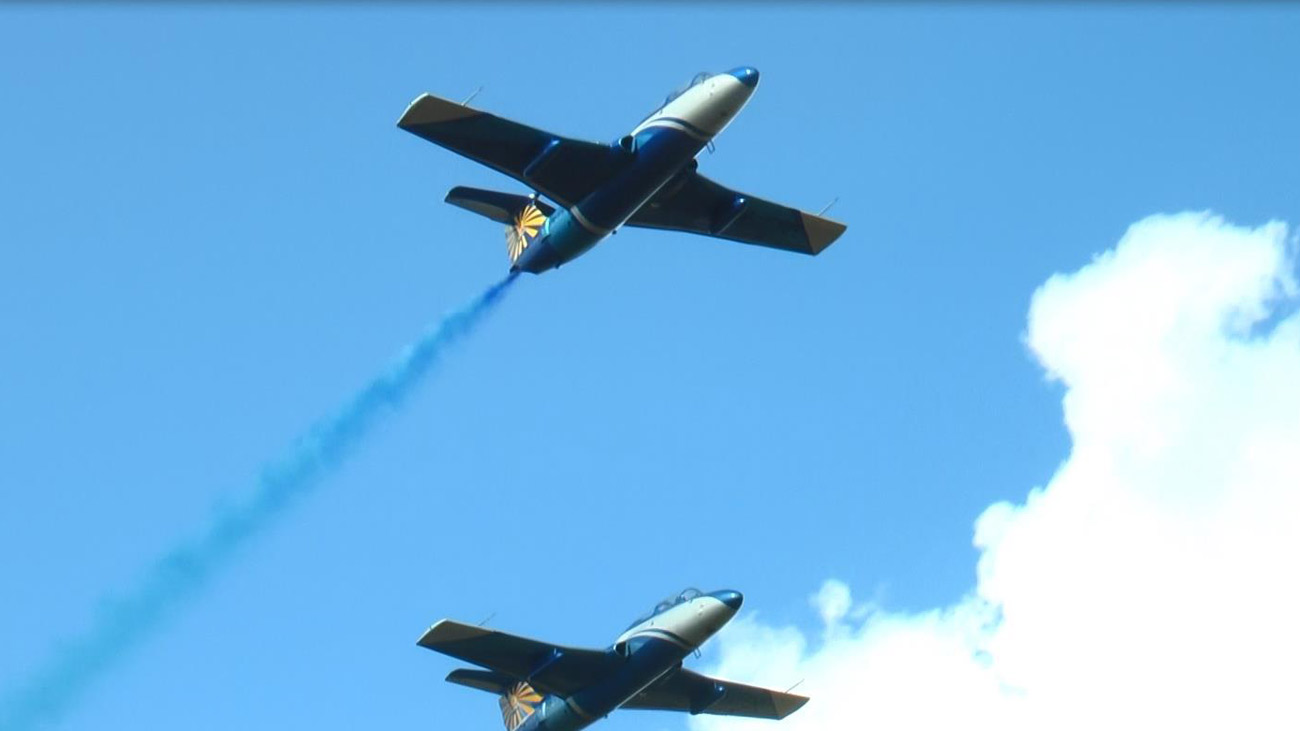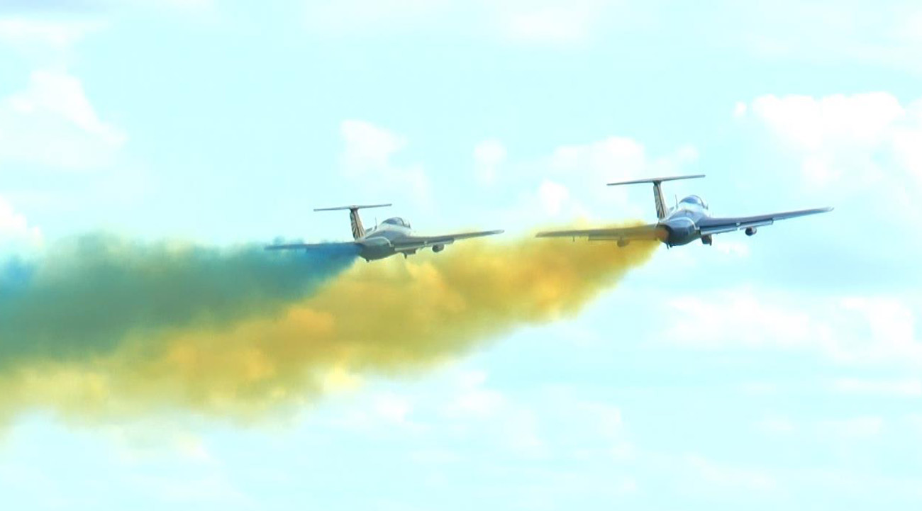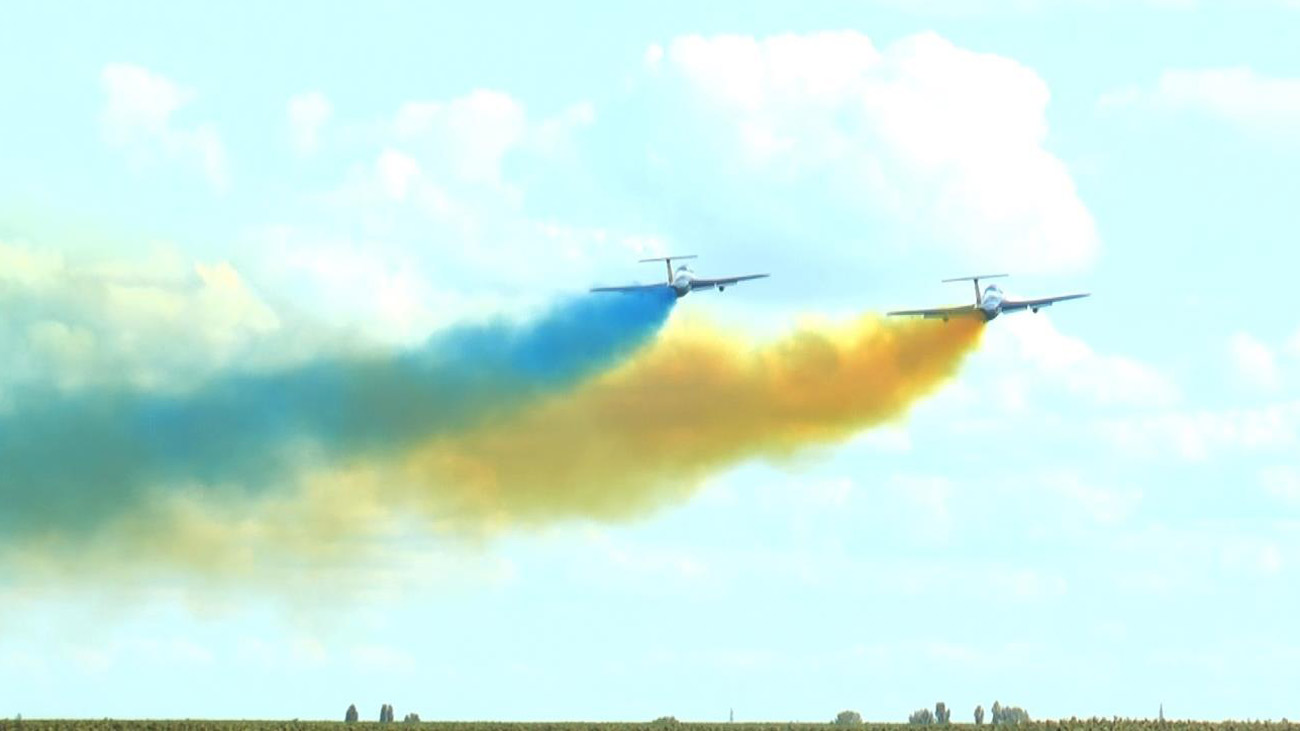 Заключительным номером праздника стал проход пары Л-29 с цветными желто-синими дымами – в небе «дельфины» показали флаг Украины.