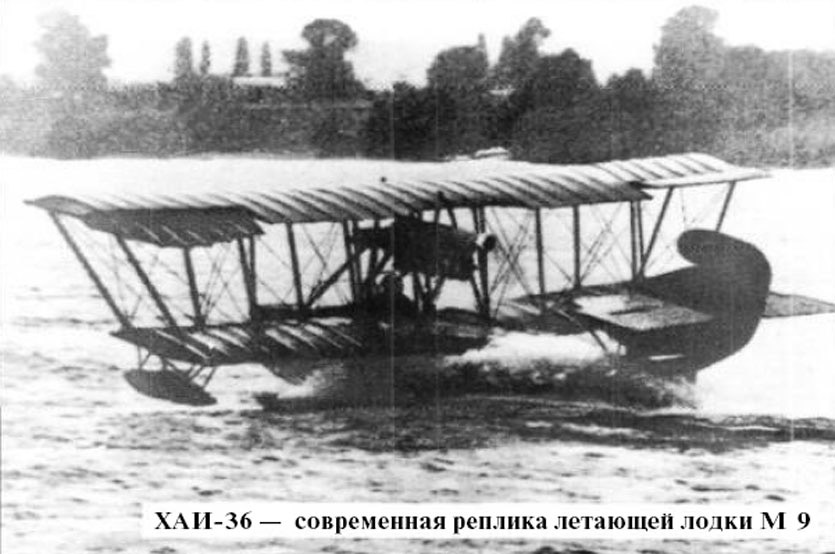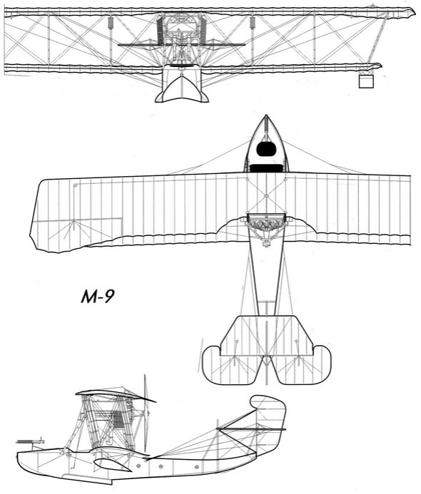 М-9 (1915 р.) - біплан з толкаючим гвинтом і двигуном водяного охолодження "Сальмсон" потужністю 150 л. с. У 1916 році був запущений в серію і випускався до 1924 року. Широкий місткий "човен-фюзеляж" мав тримісну кабіну: спереду знаходився стрілок, в розпорядженні якого на перших зразках літака був кулемет на турелі, а пізніше, в 1946 році, він був озброєний напівавтоматичною гарматою 37 мм. Перед носком нижнього крила в кабіні поруч сиділи пілот і льотчик-спостерігач. Під крилом гідролітака були підвішені бомби. По обидва боки двигуна розташовувалися водяні радіатори. Баки для пального були в верхньому крилі і між третьою, внутрішньої парою міжкрильних стійок. Під кінцями нижніх крил на стійках кріпилися невеликі опорні поплавці. Фюзеляж, крило з оперенням, а також міжкрильние стійки літаючого човна були виготовлені з дерева і обшиті фанерою і зверху полотном, крила і хвостове оперення було обшите тільки полотном. Всі троси управління рулів висоти і керма напряму розташовувалися зовні. Елерони були тільки на верхньому крилі, ширина їх до кінця крила збільшувалася. Ефективність поперечного управління від цього зростала. Кермо напряму мало компенсацію у вигляді загнутої верхньої його частини, що помітно зменшувало зусилля на ногу льотчика від педалей. Свого часу гідролітак М-9, розроблений одним з найвідоміших авіаконструкторів першої половини ХХ століття Дмитром Павловичем Григоровичем, який народився, здобув освіту і сформувався як творець авіації в Києві, мав феноменальний успіх. Таких літаків було випущено близько 500.